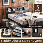 収納 ベッド シングル チェストベッド フラップ棚・照明・コンセント付多機能 国産ボンネルコイルマットレス付き シングル ベッド