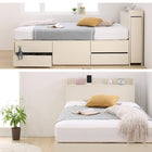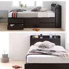 ベッド本体 【サイズ】 セミシングル:(約)幅83 X 長さ200 X 高さ87cm シングル:(約)幅98 X 長さ200 X 高さ87cm 床板までの高さ:(約)40cm 【収納部有効内寸】 スライド収納棚:(約)幅44 X 奥行き15 X 高さ20cm X 3段 深型引き出し:(約)幅51 X 奥行き38 X 深さ33cm X 1杯 浅型引き出し:(約)幅51 X 奥行き38 X 深さ13cm X 4杯 長物収納 セミシングル:(約)幅35 X 長さ178 X 深さ37cm シングル:(約)幅50 X 長さ178 X 深さ37cm 【材質】化粧繊維板 【カラー】ホワイト、ダークブラウン 【機能】2口コンセント(1500W)