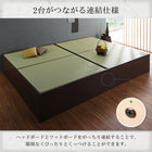 ★当ベッドは「お客様組立て家具」です★ 「お客様組立て家具」は、お客様にて開梱・組立て・設置等をお願いしております。 ベッドフレームのみです。 この商品にはマットレスは含まれていません。 ■小上がりになる美草畳連結ベッド 美草は経年劣化が起こりにくいため、 美しい状態で長くご使用いただく事ができます。 <布団が収納できる大容量収納> 2台がつながる連結仕様> ヘッドボードとフットボードをがっちり連結することで、 隙間なくぴったりとくっつけることができます。 <布団が収納できる大容量収納> 収納スペースは、仕切りが無いため多くの物を収納できる構造。 底面に敷き板もあるので、布団を清潔に収納する事ができます。 ■通気性良く清潔なすのこ> 空気が通りやすいすのこ仕様 ■お手入れも楽々 畳の取り外しが可能なので、 掃除が簡単にできます。 ■老舗メーカーの高品質フレーム フレームはSG(製品安全協会)が認める優良工場で製造。 デザインから生産まで一貫して国内で行っています。 ■SEKISUIの伝統的な畳織 島根出雲市の「出雲工場」で製造。 古来の伝統を守り、1本1本織機で編み、品質の高い製品を生産しています。