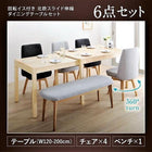 | スライド伸縮 ダイニングテーブルセット 6点セット テーブル+チェア4脚+ベンチ1脚 W120-200 |